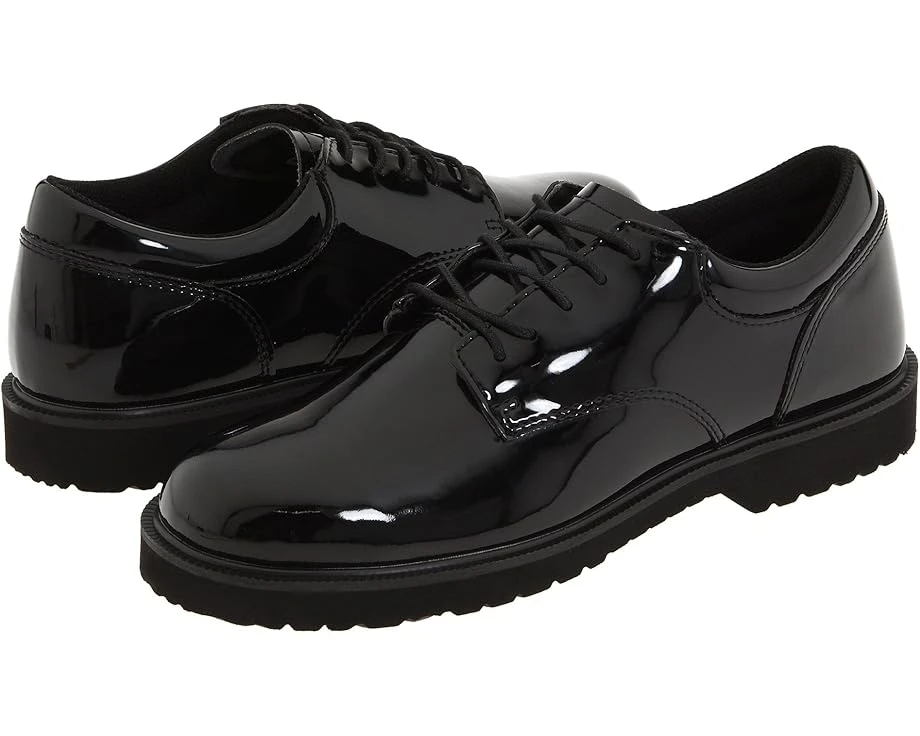 With a presentable finish, lace-up closure, and a padded collar for comfort, the Bates Footwear® High Gloss Uniform Oxford makes sure you pass inspection.SKU: #7644936Style number: E22141.High gloss synthetic upper adds style.Traditional lace-up system for a secure fit.Cement construction.Breathable mesh lining keeps feet cool throughout the day.Soft Toe.Lightly cushioned footbed for added comfort.Rubber outsole provides slip-resistant protection.Easy to clean high gloss upper.Slip resistant meets the ASTM F2913 standards for Whole Shoe Slip.Imported.Product measurements were taken using size 9, width D – Medium. Please note that measurements may vary by size.Weight of footwear is based on a single item, not a pair.Measurements: