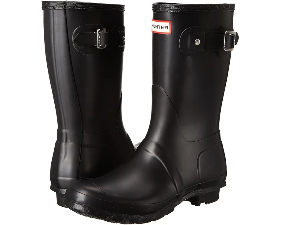 Note: Select your US size. Please be advised, the product and box will display UK, US and Euro sizing. For US sizing, both men’s and women’s sizing is displayed. Men’s sizing is represented by “M” and women’s sizing is represented by “F”. SKU: #7636909Strut the Hunterβ’ Original Short Boot down the streets, into the city and back to the countryside with ease.This product is certified vegan and is constructed with no animal parts for materials or bindings. Vulcanized natural rubber construction.Signature Hunter logo on the front.Quick dry woven nylon lining.Multi-layer cushioned sponge insole.Please keep in mind that the buckle on this boot is merely decorative and should not be used as an aid to pull the boot on.Traditional calendared natural rubber sole.The brand advises that a white wax film may appear on the surface of the rubber boots and that it can be wiped off with a damp cloth. This “blooming” effect is not a defect. Blooming is caused when the boots are exposed to extreme temperatures or temperature swings and the wax helps prevent the rubber from weathering.Imported.Product measurements were taken using size 6, width M. Please note that measurements may vary by size.Measurements: