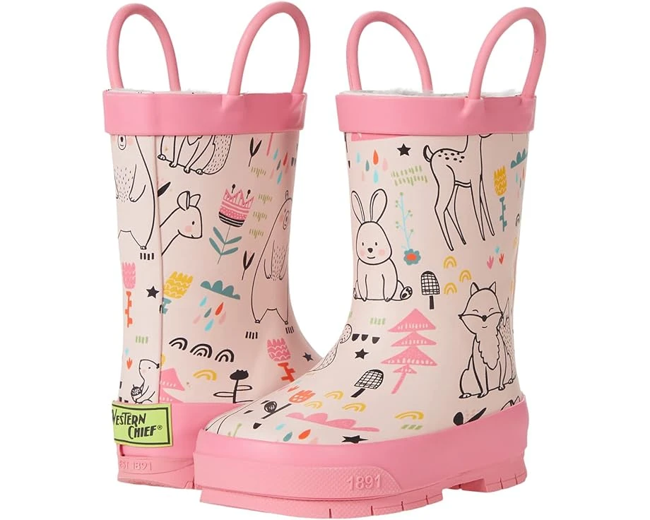 Keep your little one protected from the rain wearing these Western Chief Kids® Boots. This pair comes with pull tabs on the side for easy on/off. SKU: #9546705Rubber upper.Man-made lining and insole.Allover printed design.Signature logo on the back.Pull-on style.Non-marking outsole.Imported.Product measurements were taken using size 5 Toddler, width M. Please note that measurements may vary by size.Weight of footwear is based on a single item, not a pair.Measurements: